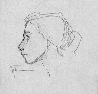 I'm fascinated by the range of faces out there, and the boundless emotions & expressions that they're capable of. Several people have asked what I use for reference in my figure drawings. I use a variety of sources, the best/favorite being live models. But finding someone willing to pose isn't always the easiest. Plus it doesn't provide the candid expressions you can see when someone is unaware they're being observed. So more often I'm inspired by the fleeting glimpses of people throughout the day. There'll be an expression, feature or something distinctive about them that inspires a drawing. Sitting at a red light yesterday I looked in the rear view mirror and saw the face of the woman driving behind me, illuminated by strong sunlight. I quickly memorized the shape of her face, angles of her mouth, and when I got to the studio I drew as much of my "mental polaroid" as I could. Sometimes the likeness is close, sometimes not. But it's those transient moments where the subject is between thoughts, or detached from themselves for an instant that I love most. Hard to capture, but it's the real, natural exhibition of everyday life that makes a compelling image to me.